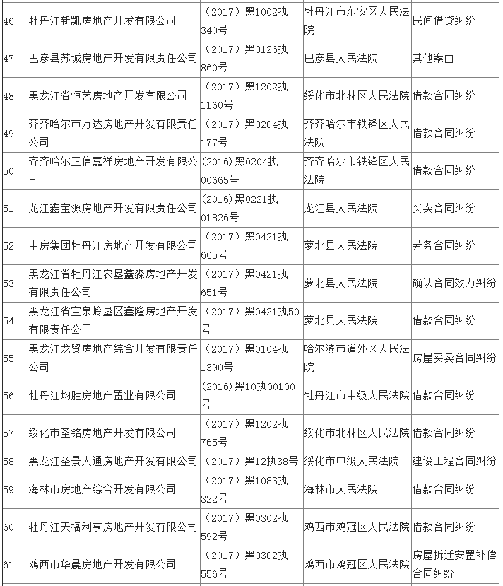 黑龙江省高级人民法院发布房地产失信被执行人名单