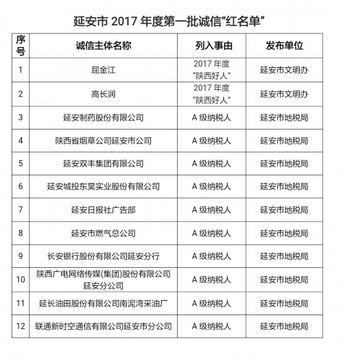 发布时间: 2017-12-15 16:43:39近日,市委网信办(市信用办)会同市文明办、市地税局等有关部门,对所属行业诚信“红名单”信息进行了归集审查,将依法纳税、诚信经营的A级纳税人共10家企业和获得“陕西好人”称号的2名自然人,列入诚信“红名单”。入围诚信“红名单”的企业和自然人将在市政府门户网站、“信用延安”网站和爱特延安等相关媒体和网络平台上发布,并录入全省公共信用信息平台。本次诚信“红名单”的发布旨在褒扬诚信,营造“守信光荣”的社会风尚,引导和促进企业、公民讲社会责任、讲守法经营、讲公平竞争,对进一步优化我市营商环境,弘扬企业诚信文化,树立企业诚信品牌,全面推进信用延安建设具有重要意义。