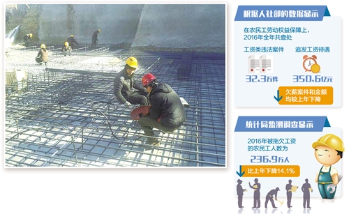 人社部数据显示,在农民工劳动权益保障上,2016年全年共查处工资类违法案件32.3万件,追发工资待遇350.6亿元,使得欠薪案件和金额均较上年下降。统计局监测调查显示,2016年被拖欠工资的农民工人数为236.9万人,比上年下降14.1%。