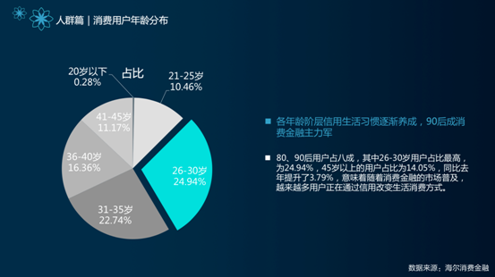 《报告》显示80、90后用户占八成,其中26-30岁用户占比最高为24.94%,90后已然成为消费金融主力军。不过也有数据显示,45岁以上的用户占比为14.05%,同比去年提升了3.79%,意味随着消费金融的市场普及,越来越多的用户正在通过信用改变生活消费方式。