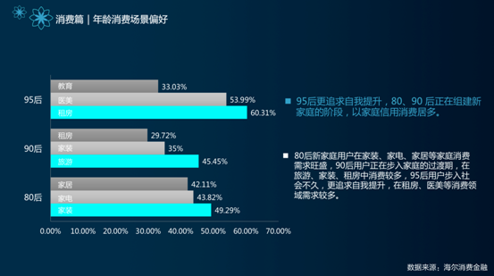 那么作为消费主力的80、90后喜欢把钱花在什么地方?正在崛起的95后一代又是如何剁手的?80后用户的买买买基本都花在了为新家装修、买家电、买家具上面,90后正处在从单身走入婚姻的过渡阶段,旅游、家装、租房分期产品更加受欢迎,有个性的95后更加追求自我提升,在租房上的消费开支比较大,很爱美但也爱学习。