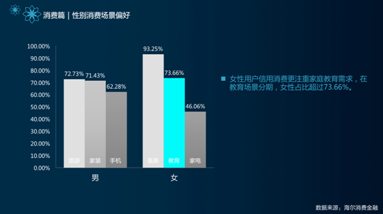 《报告》显示,女性用户占比45.23%,同比去年提升了9.99%,女性信用消费意识正在不断崛起。其中女性用户信用消费更注重家庭教育需求,在教育分期场景中女性占比超过73.66%。