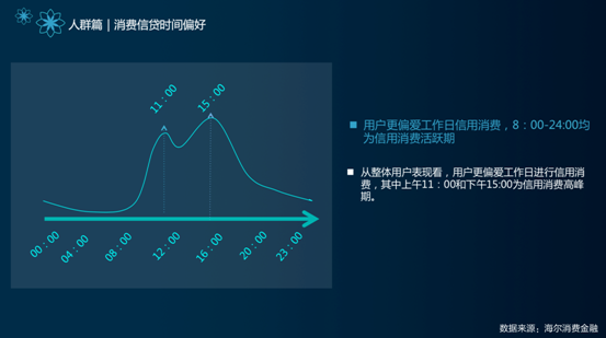 海尔消费金融用户更习惯在工作日进行信用消费,一天的8:00-24:00均为信用消费活跃期,其中上午11:00和下午15:00是全天信用消费的高峰期。